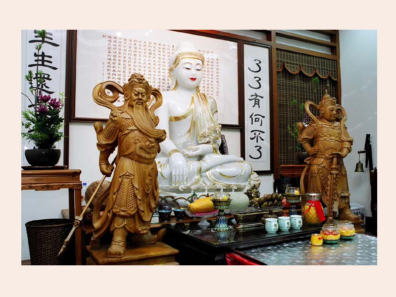 質樸淡雅的中心禪堂,壇城設立在堅樸厚實的檜木桌板上,高約兩公尺的緬甸玉佛端坐其中,慈目肅容,莊嚴的攝受力,讓來訪者在進入中心時,立即生起清淨安定的歸屬感。