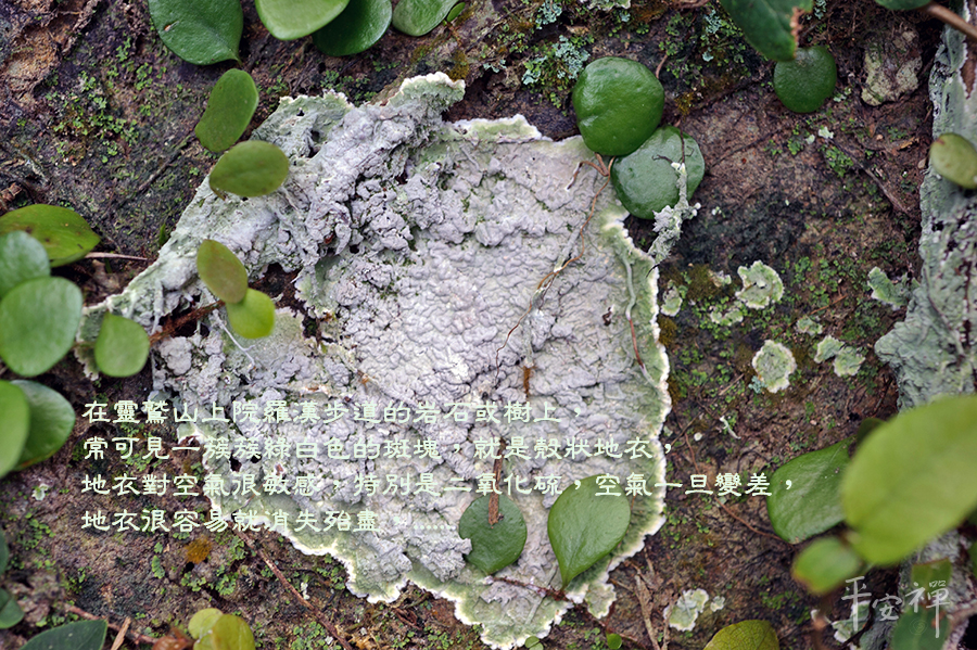 在靈鷲山上院羅漢步道的岩石或樹上,常可見一簇簇綠白色的斑塊,就是殼狀地衣,地衣對空氣很敏感,特別是二氧化硫,空氣一旦變差,地衣很容易就消失殆盡,因此,被視為是空氣品質的指標植物。