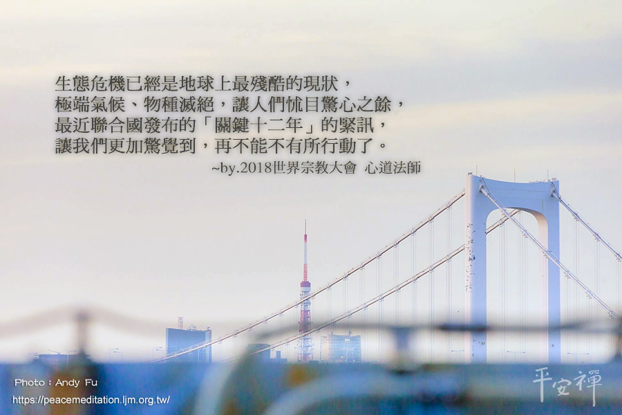 靈鷲山心道法師在2018世界宗教會議(PoWR)上也提到,生態是地球整體維生系統的總和,這個生態系統是「有機性」的,一旦這個「有機性」被破壞,將是不可逆轉的災難。近年來,生態危機已經是地球上最殘酷的現狀,極端氣候、物種滅絕,讓人們怵目驚心之餘,最近聯合國發布的「關鍵十二年」的緊訊,讓我們更加驚覺到,再不能不有所行動了。