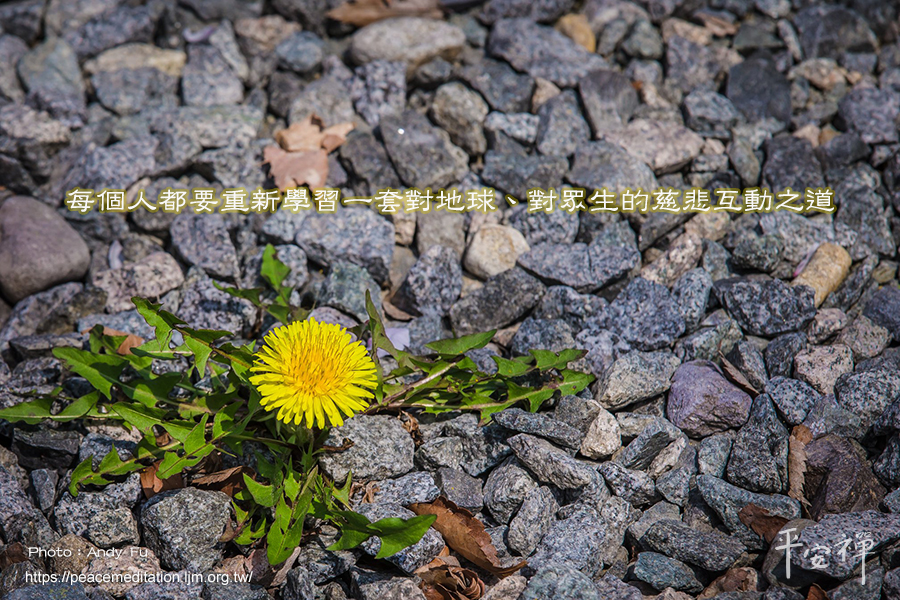 聯合國環境保護署說,科學清清楚楚告訴我們,人類的健康和延續與環境好壞直接相關。我们正處於地球生存的十字路口,究竟是繼續執迷不悟的大肆開發還是有限度的發開並全力保護我們的環境。靈鷲山心道法師多年來推廣提倡的愛地球九大生活主張運動,地球要活得健康,我們要禪修淨化習氣、回歸本來,心清淨了世界才會清淨,找回心的寧靜和平,只有心和平了才會熄滅爭端,知道感恩,世界才會和平,地球才能平安,因此每個人都要重新學習一套對地球、對眾生的慈悲互動之道。
