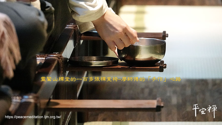 廖師傅不是第一次做禪凳椅,這次為靈鷲山禪堂製作的一百多張禪凳椅,仍延續了廖師傅手工藤家具一貫的質感與美感,比較特別的設計是坐椅下方內建一片可拉出、收回的活動托盤(放茶杯用),既好用又細致。當這批禪凳椅完工、安放在禪堂裡時,那幅畫面連廖師傅自己都很感動,「整體的感覺太契合了!好像眼睛和鼻子長在一張臉上一樣,完全相融,沒有一點不協調,很莊嚴,很美。」