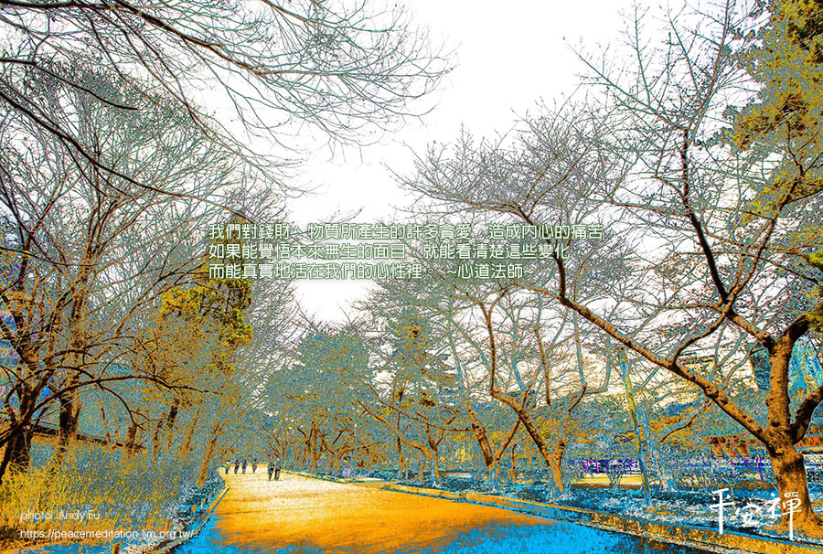 我們對錢財、物質所產生的許多貪愛,造成內心的痛苦,如果能覺悟本來無生的面目,就能看清楚這些變化,而能真實地活在我們的心性裡。