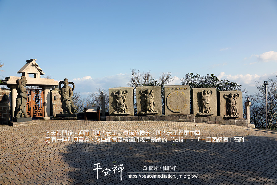 入天眼門後,迎面「四大天王」傳統造像外,四大天王石雕中間,另有一座別具意義、來自緬甸摩構禪師親手創繪的「法輪」︰「十二因緣圖」石雕。