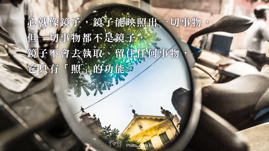 我們的心就像鏡子,鏡子能映照出一切事物,但一切事物都不是鏡子,鏡子也不會去執取、留住任何事物,它只有「照」的功能。我們看一切事物,要如觀鏡中影、水中月,聽一切音聲如風吹過樹,心時時都在覺知上,不會攀緣外境。