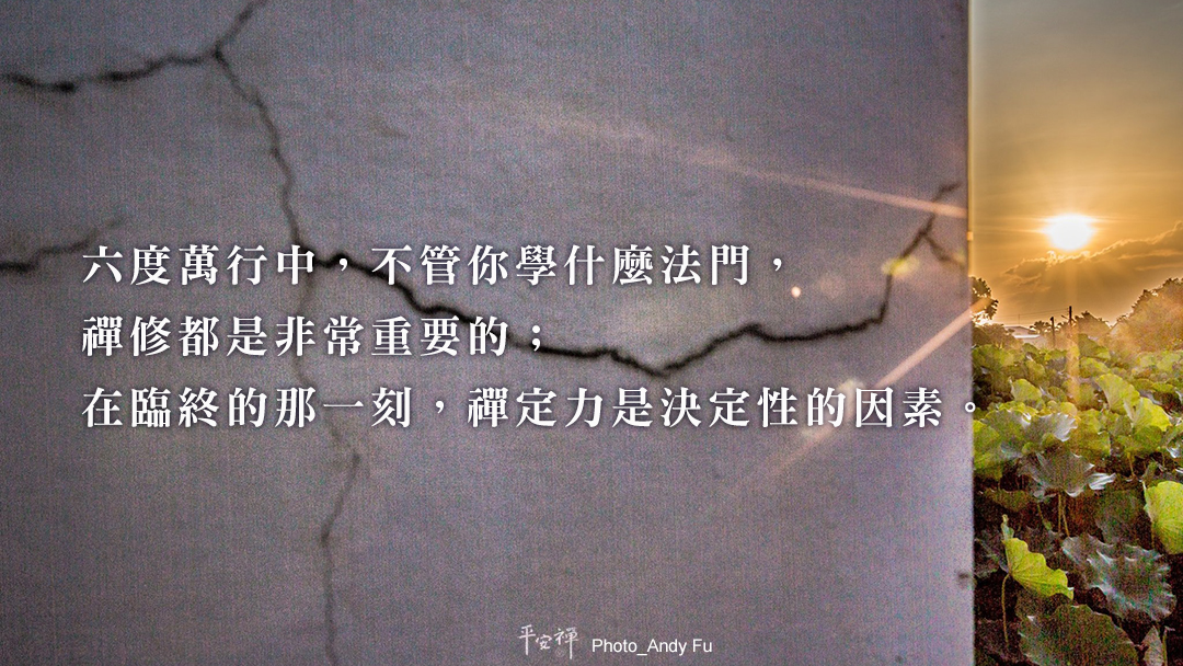 在學佛的路上,雖說有八萬四千法門,但六度萬行中,不管你學什麼法門,禪修都是非常重要的;在臨終的那一刻,禪定力是決定性的因素。