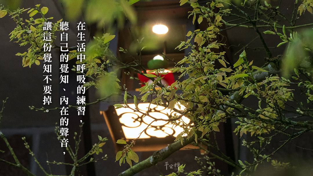 怎麼練習呢?首先你要覺察自己的身體。大家還記得平安禪的第一個步驟嗎?喉嚨吸氣、鼻子吐氣,深深地吸氣(覺察自己的身體)、吐氣(放鬆自己的身體,讓心平靜)。藉由在生活中呼吸的練習,聽自己的覺知、內在的聲音,讓這份覺知不要掉。