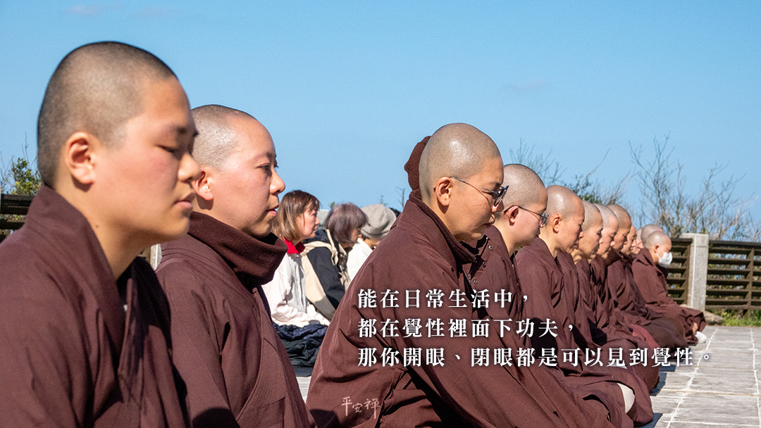 開了眼睛可以看到覺性,閉了眼睛可以看到覺性,白天、晚上一樣,功夫都在,不變。黑夜、白天都可以見到覺性的光明。有差別相,那你就沒有辦法內外一如。