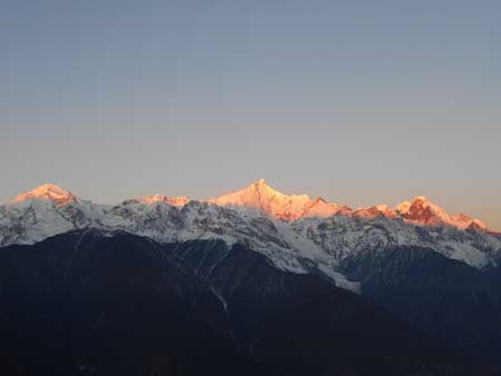 次日早上,我們順利看到了日照金山——升起的太陽,將白色的雪山從頂端向下一點一點、一層一層地變成金色。