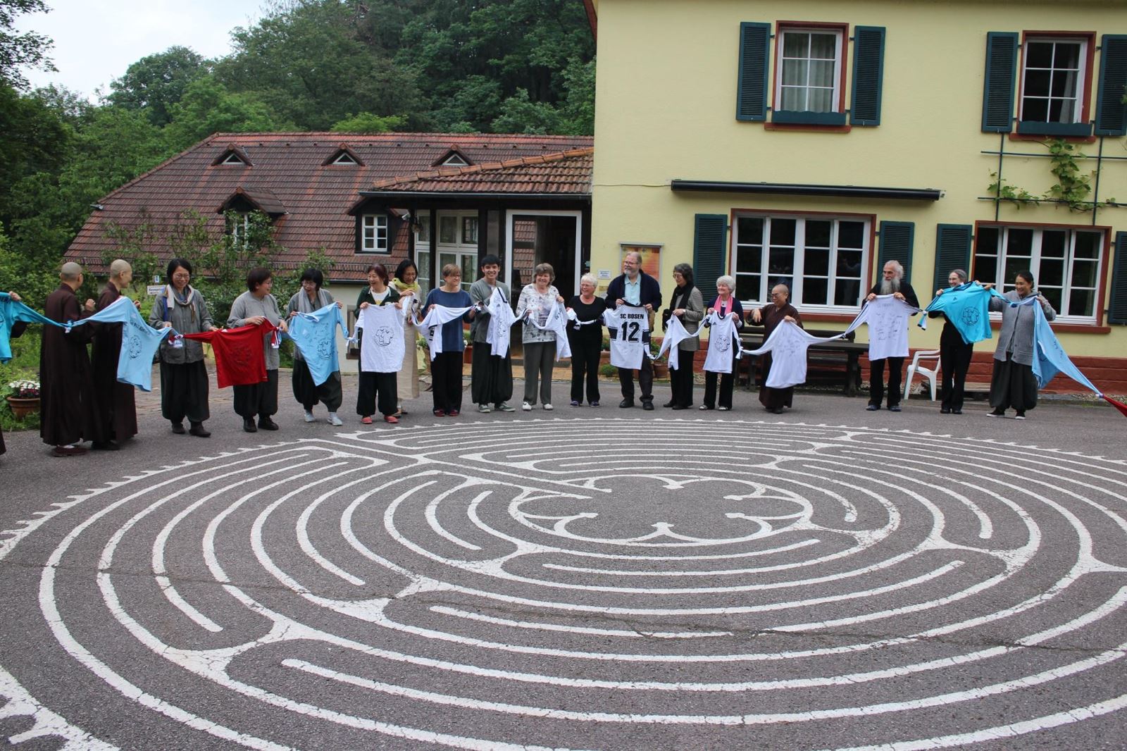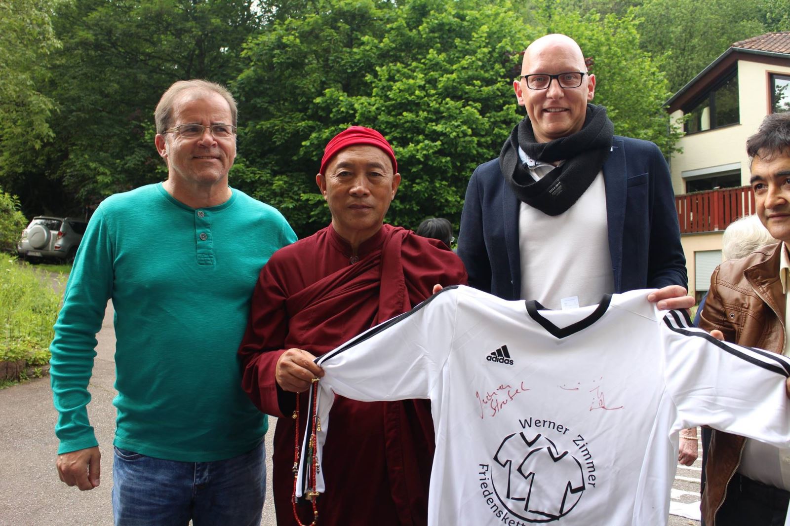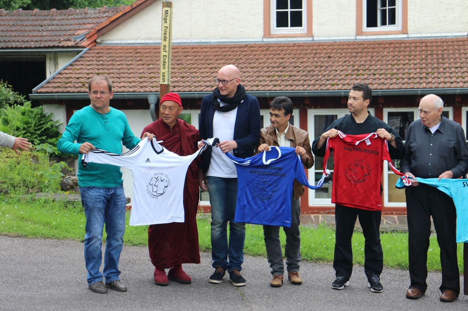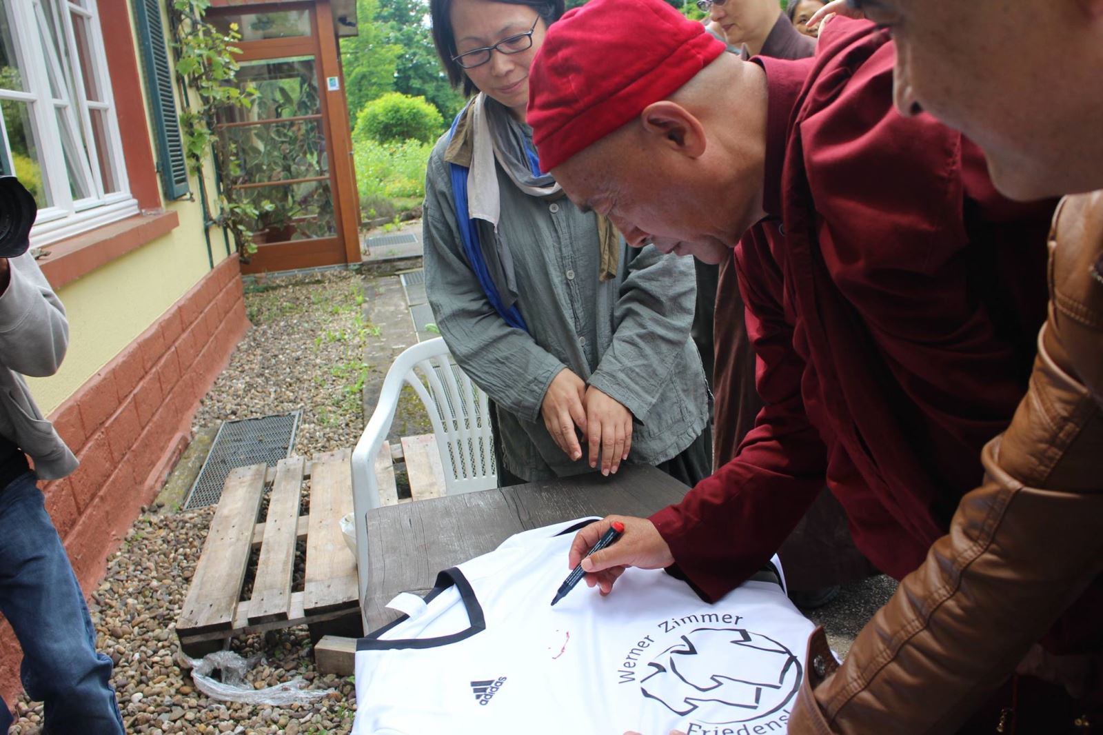 6月4日,在Neumuehle禪修中心閉關圓滿的這一天,「德國義大利教育文化組織」的成員來到禪修中心,他們是一群以運動球衣做為連結來推廣和平理念的朋友!組織創辦人Santalucia告訴心道法師,因為德國人喜歡足球運動,就想到以球衣簽名來串聯大家一起傳遞愛與和平。
