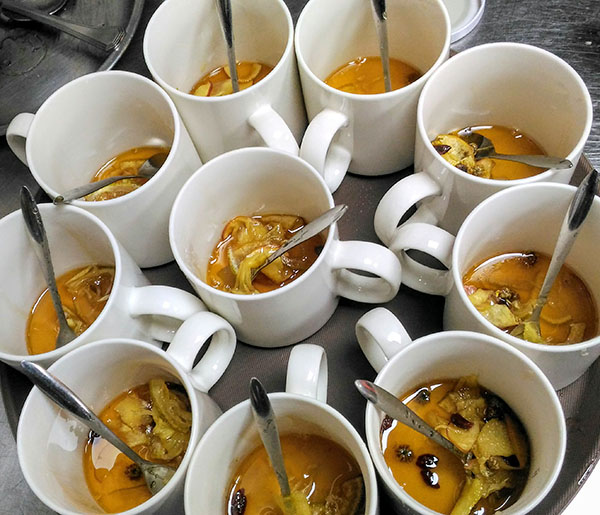 不一會兒,水果蜜熬製完成。在杯子裡加一些水果蜜、沖上熱紅茶,「可依個人喜好或方便再加入一些新鮮水果。」——每個人手中陡然都有了一杯美味鮮香熱騰騰的水果茶,大伙品啜著,臉上都是暖暖的笑意。